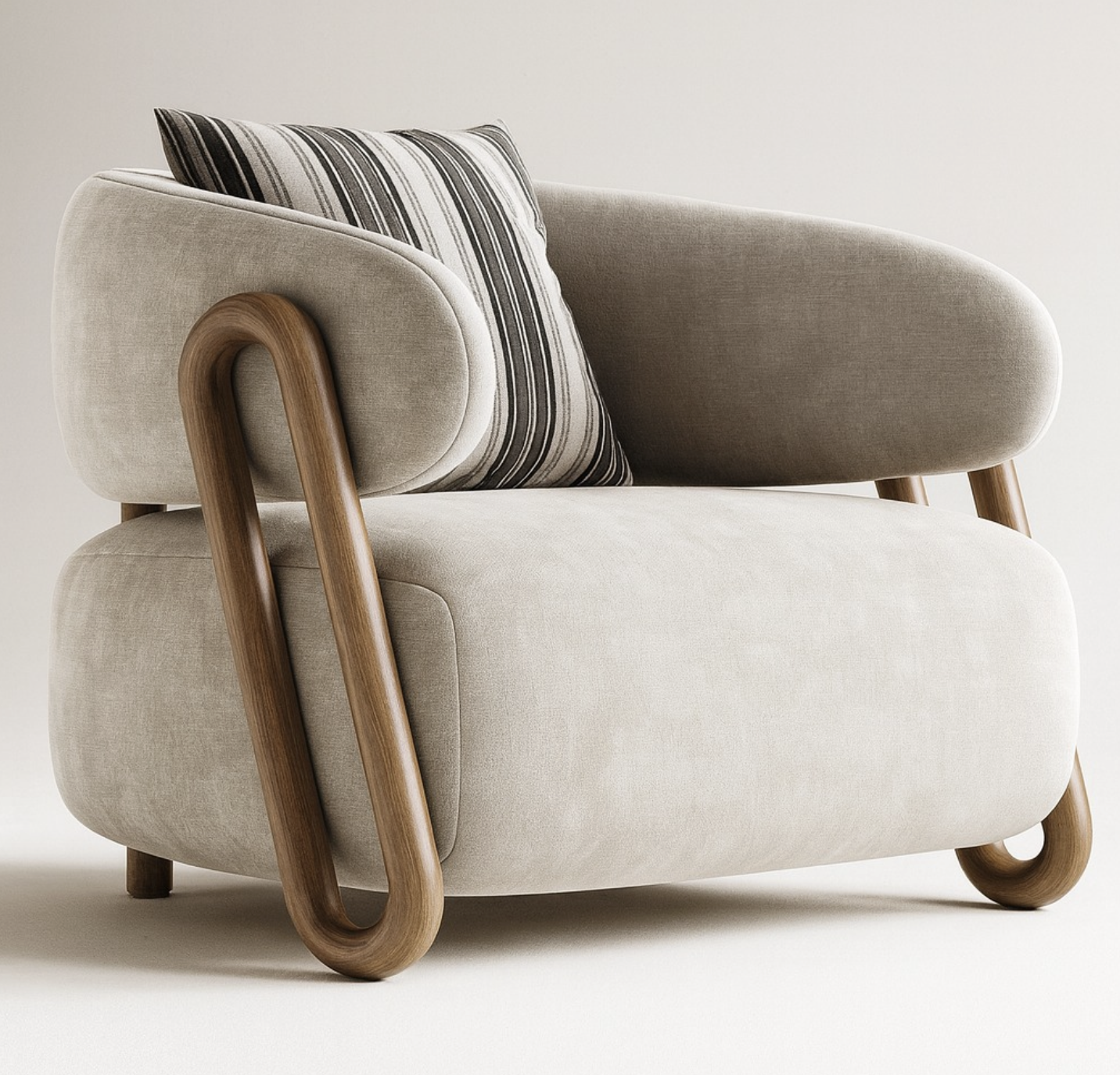 The Sora Lounge redefines modern relaxation through the lens of fluid geometry. Its most striking feature, a continuous, hand-finished wooden loop, serves as both the structural base and a stunning visual anchor. This frame supports two generously proportioned cushions that appear to hover, offering a weightless aesthetic. Finished in a soft, premium neutral textile and accented with a classic striped lumbar pillow, the Sora is designed for those who appreciate the intersection of daring design and daily utility.